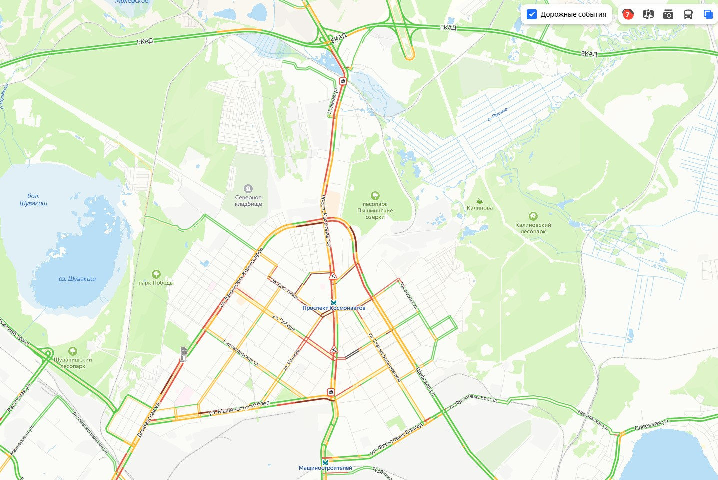 По данным сервиса «Яндекс.Карты» заторы сейчас наблюдаются на проспекте Космонавтов, улице Восстания и Бакинских Комиссаров. Пробки, несмотря на то что еще день, уже оцениваются в семь баллов.
