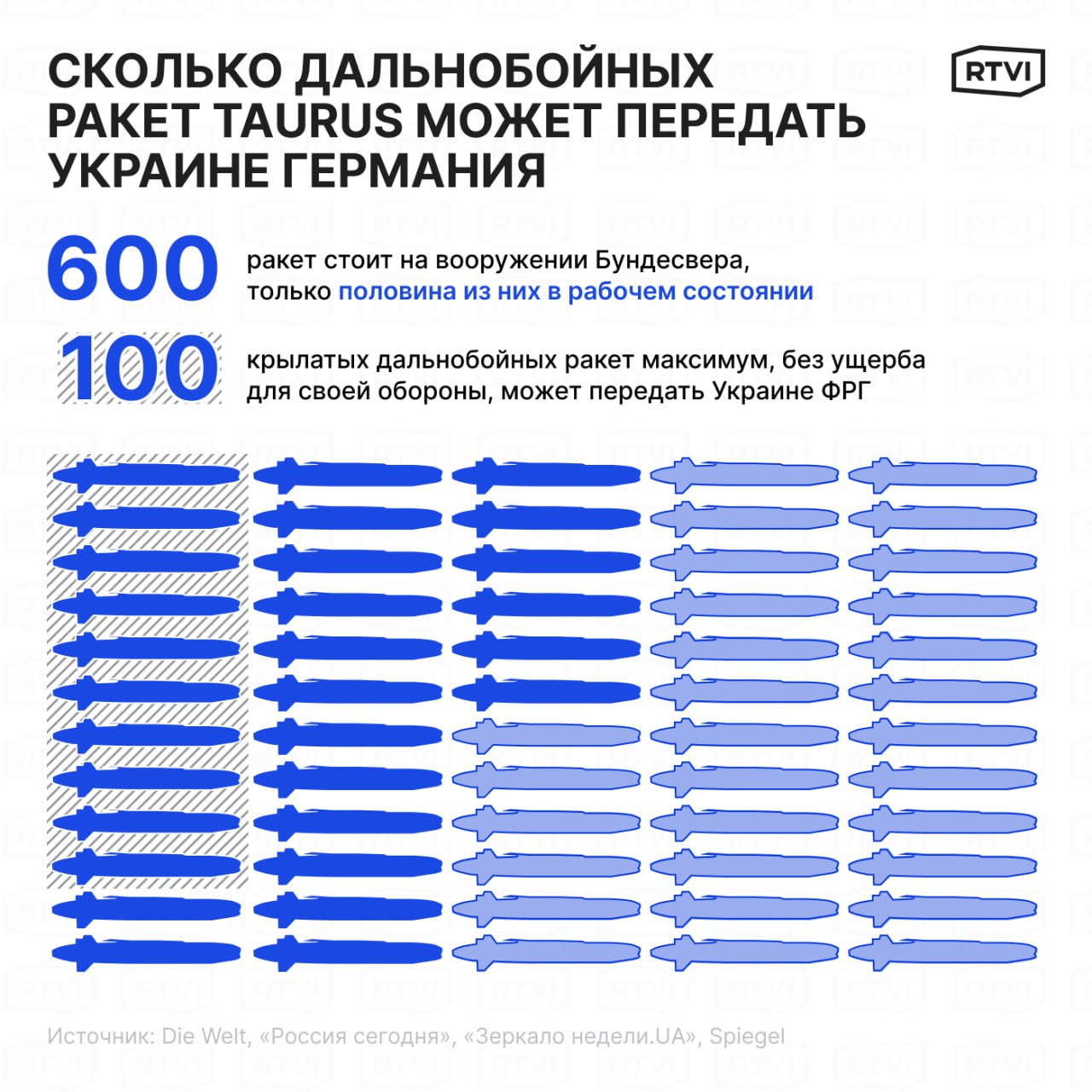 Точное количество ракет Taurus в арсенале Бундесвера засекречено. Известно, что их около 600, но не все они работоспособны, так как у части истек срок сертификации. Украинский военный обозреватель и главный редактор Defense Express Олег Катков считает, что Германия может себе позволить безболезненно передать Украине до 100 ракет