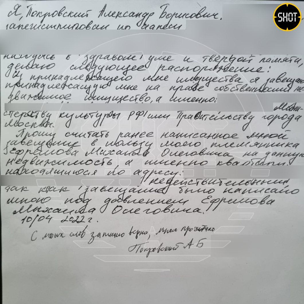 В беседе с SHOT юристы рассказали, что само видео едва ли будет иметь юридическую силу, кроме того, ещё придется установить, сделано ли оно без монтажа и переозвучки, был ли Александр Покровский "в здравом уме", не оказывали ли на него давление. Также адвокаты считают, что вкупе с письменным завещанием можно попробовать судиться. Но какой будет итог — непонятно. Потому что подобных прецедентов еще не было.