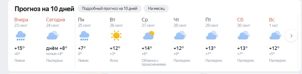 По данным сервиса «Яндекс.Погода», начало недели будет холодным. Ночью температура опуститься до 0 градусов. До следующих выходных днем будет +12...+14 градусов. Дождь ожидается только во вторник.