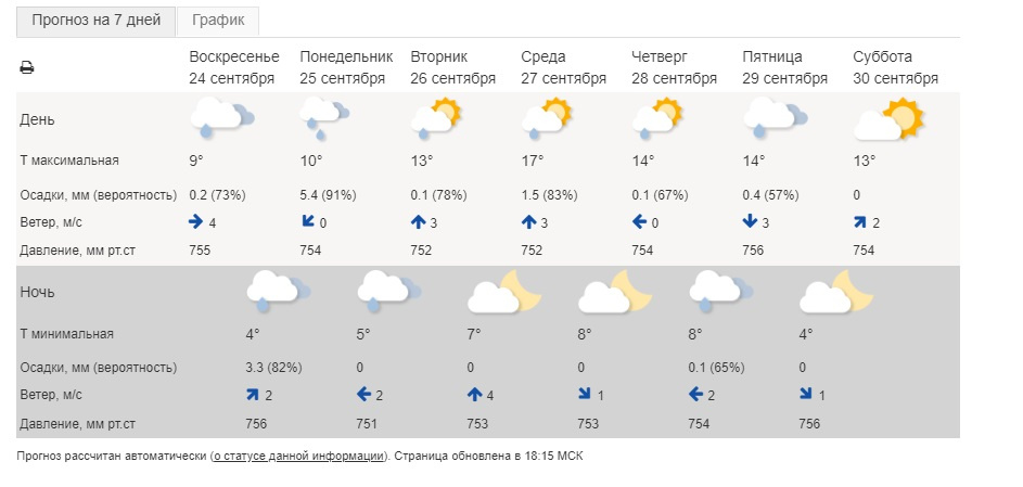 Gismeteo обещает во вторник ночью заморозки до -1 градуса. В среднем температура в темное время суток всю неделю будет держать в пределах +4...+6 градусов. Днем будет около +12...+14 градусов.