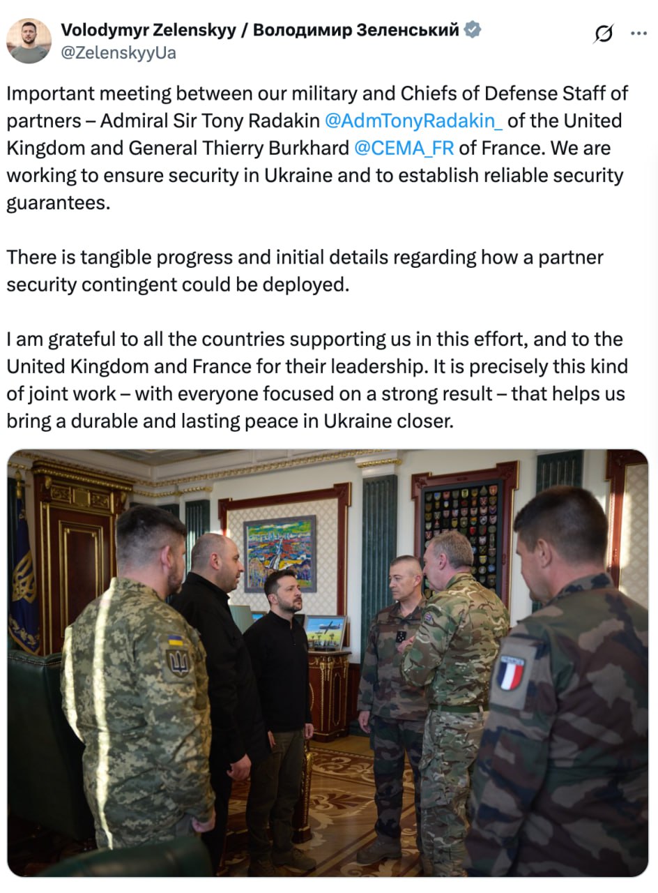 «Важная встреча между нашими военными и начальниками штабов обороны стран-партнёров — адмиралом сэром Тони Радакином (Великобритания) и генералом Тьерри Бюркаром (Франция). Мы работаем над тем, чтобы обеспечить безопасность в Украине и выработать надёжные гарантии безопасности.