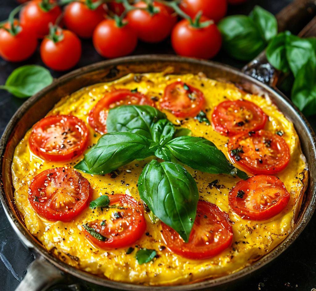5. Взбейте яйца,добавьте содержимое сковороды. Разогрейте на сильном огне смесь 1 ст. л. оливкового масла со сливочным. Вылейте на сковороду яично-помидорную смесь. На сильном огне готовьте 5 мин.