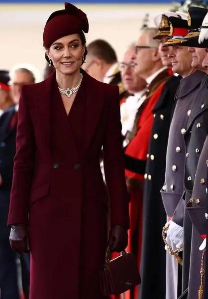 3 декабря вместе с принцем Уильямом Кейт встретила гостей из Катара. С рабочей поездкой, которая продлилась два дня, прибыл эмир Катара Тамим бин Хамада Аль Тани с первой из трех своих жен Джавахир. На официальном приеме Кейт появилась в элегантном костюме самого модного цвета этого сезона, бургунди. На принцессе было строгое платье-пиджак, которое эффектно подчеркивало фигуру монаршей особы, а также миниатюрная шляпка в тон и сапоги на небольшом каблуке. Завершала образ маленькая сумочка Chanel винного цвета. Яркой деталью в образе Миддлтон стало жемчужное колье.