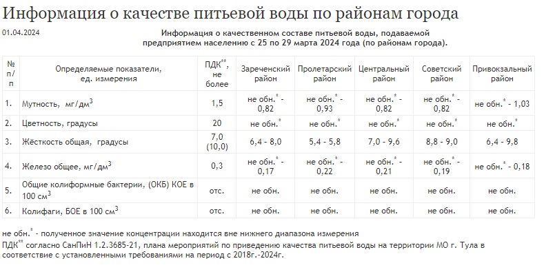 О показателях качества питьевой воды в пяти округах Тулы с 25 по 29 марта 2024 года информируют специалисты АО «Тулагорводоканала».