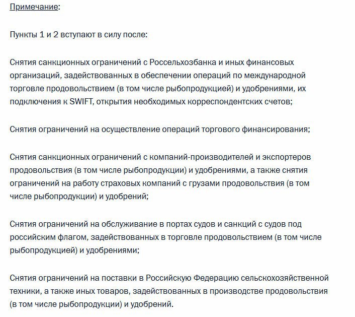 – США снимает санкции с Россельхозбанка и возвращает ему доступ к SWIFT, а также будет способствовать восстановлению доступа российского агроэкспорта на мировой рынок;