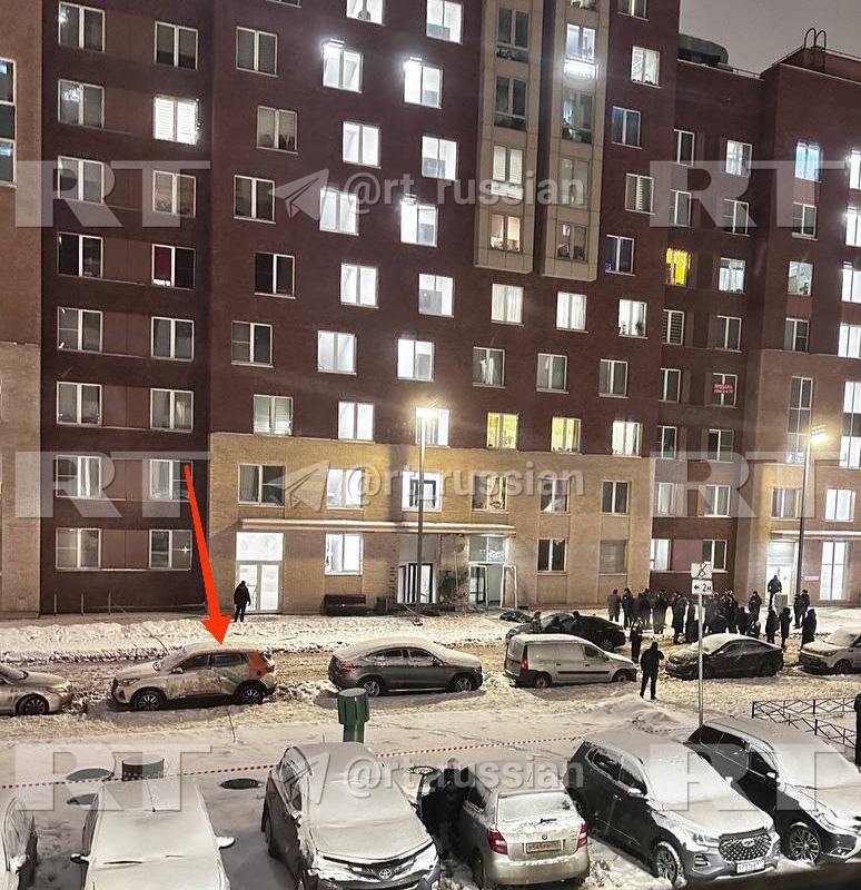 Это авто стояло у подъезда. Именно к нему сразу подошла собака силовиков, рассказала RT очевидец. Ту же машину проверял робот-сапёр.