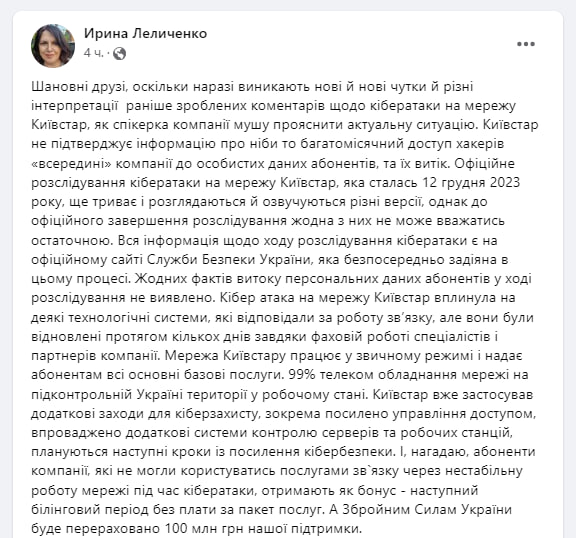 «Киевстар» не подтверждает заявление СБУ о том, что хакеры много месяцев находились в системе оператора, — представительница мобильного оператора Ирина Леличенко
