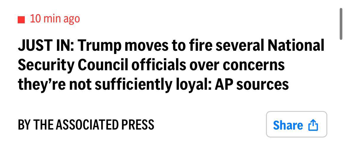 ❗️Associated Press: Трамп уволит нескольких сотрудников Совета национальной безопасности Белого Дома «за недостаточную лояльность».