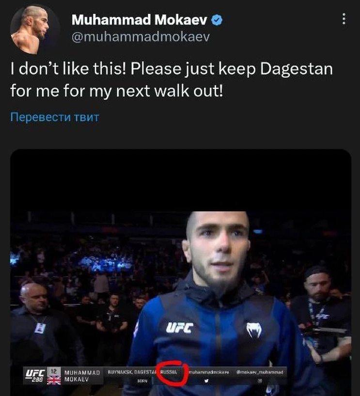 В прошлом году Мокаев попросил президента легендарной UFC Дану Вайта удалить из его био слово "Россия", оставить только название республики и его родного города. Этим летом его выгнали из Ultimate Fighting Championship за то, что втайне вёл переговоры с другой организацией. Он просился обратно, за него вступался Нурмагомедов и другие бойцы.