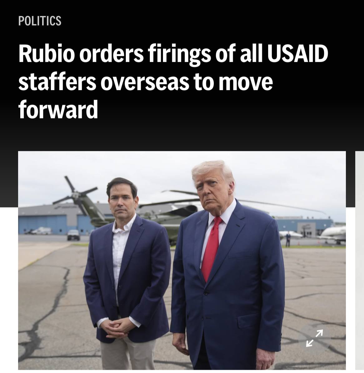 «Федеральный судья временно заблокировал указ Трампа о массовых увольнениях в нескольких федеральных агентствах <…>, и истцы говорят, что план реорганизации Рубио, похоже, нарушает этот судебный запрет. Но администрация Трампа говорит, что план уже был реализован, когда президент издал приказ, поэтому нарушения нет».