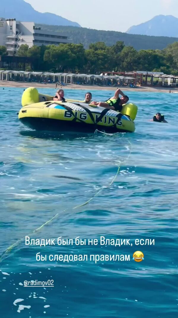 В один момент Радимову развлечение показалось скучным и он спрыгнул с «таблетки» прямо в воду. «Владик был бы не Владик, если бы следовал правилам», — прокомментировала поступок мужа Анастасия.