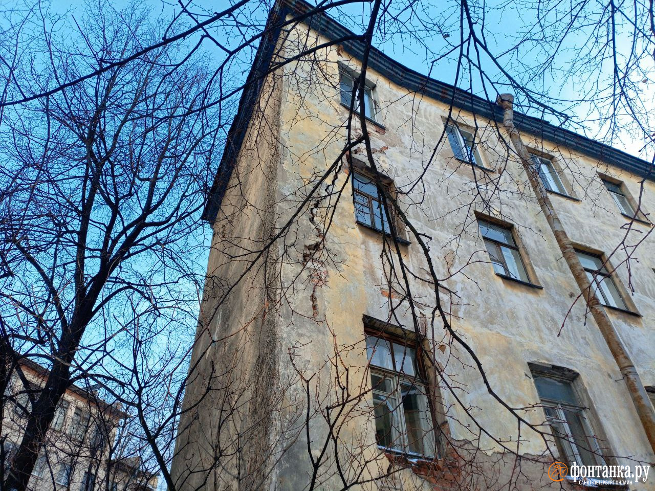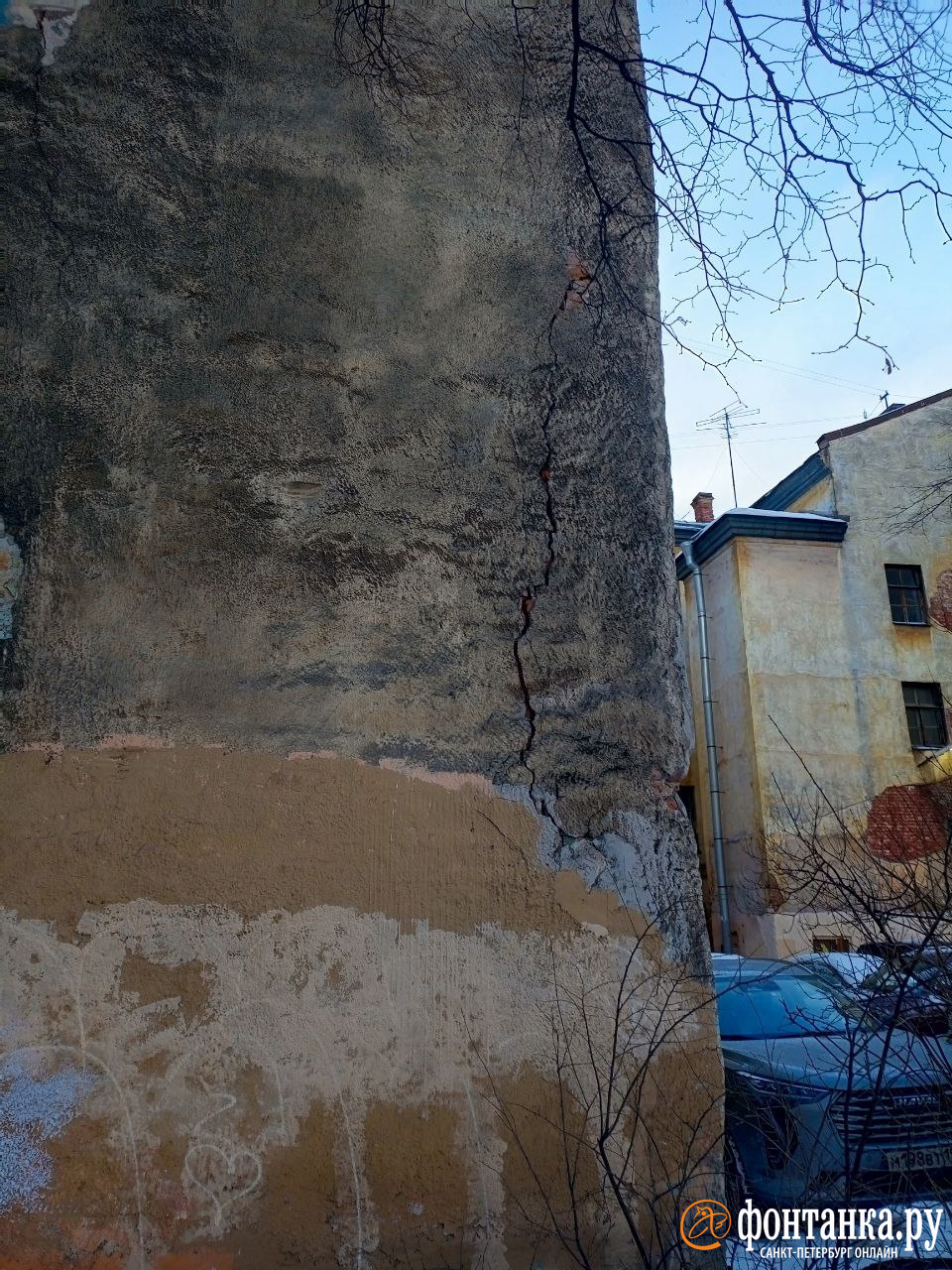 На углу дома — несколько трещин. Николай пояснил, что на них стоят маячки, и никаких изменений в их состоянии в последнее время не было. Он предположил, что чиновникам просто пришел приказ расселить флигель после обрушения на Гороховой, а то «не дай Бог».