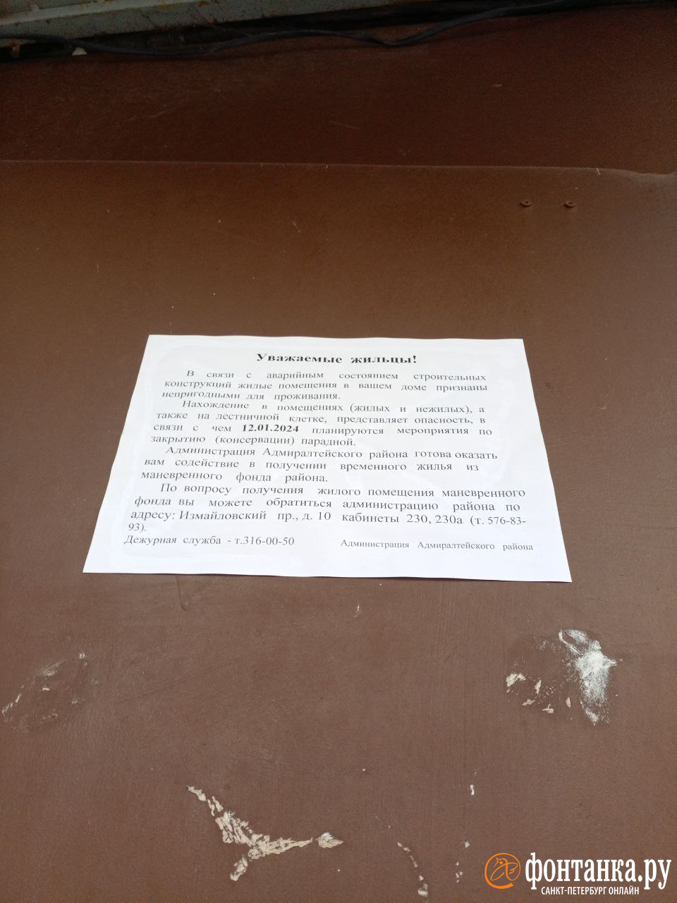 Немногочисленные жители четырехэтажного дома № 71А по Садовой улице обнаружили на двери парадной (а это дворовый флигель с одним входом) объявление: «В связи с аварийным состоянием строительных конструкций жилые помещения в вашем доме признаны непригодными для проживания. Нахождение в помещениях (жилых и нежилых), а также на лестничной клетке, представляет опасность, в связи с чем 12.01.2024 планируется мероприятие по закрытию (консервации) парадной». Ниже — приписка, что администрация Адмиралтейского района «готова оказать содействие в получении временного жилья из маневренного фонда района».