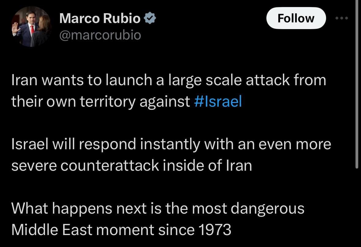 Сенатор США Марко Рубио предостерегает Иран от удара по Израилю и опасается дальнейшего роста эскалации в регионе.