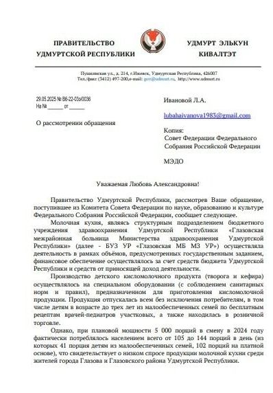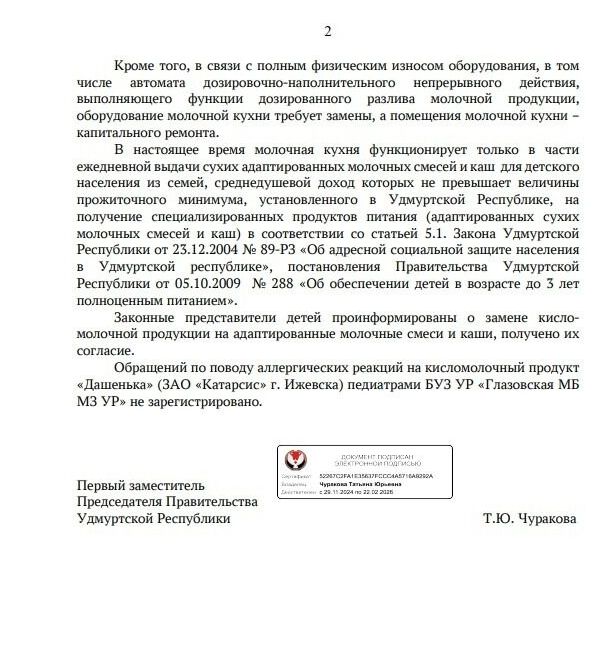 «Но вместо оказания содействия, власти региона пошли на беспрецедентные действия в виде окончательного закрытия молочной кухни в БУЗ УР „Глазовская МБ МЗ УР“ и увольнения по сокращению штата всех сотрудников данного структурного подразделения. В своем ответе первый заместитель председателя правительства республики Т. Ю. Чуракова указала о целесообразности прекращения выпуска кисломолочной продукции, с чем мы категорично не согласны. Мы считаем, что это противоречит политике федеральных властей страны, чьи действия как раз направлены на предоставление полноценной продовольственной помощи детям, включая как заменители грудного молока, так и неадаптивные молочные продукты — кефир, творожки, которые вводятся в прикорм с раннего возраста», — комментирует профсоюзный активист.