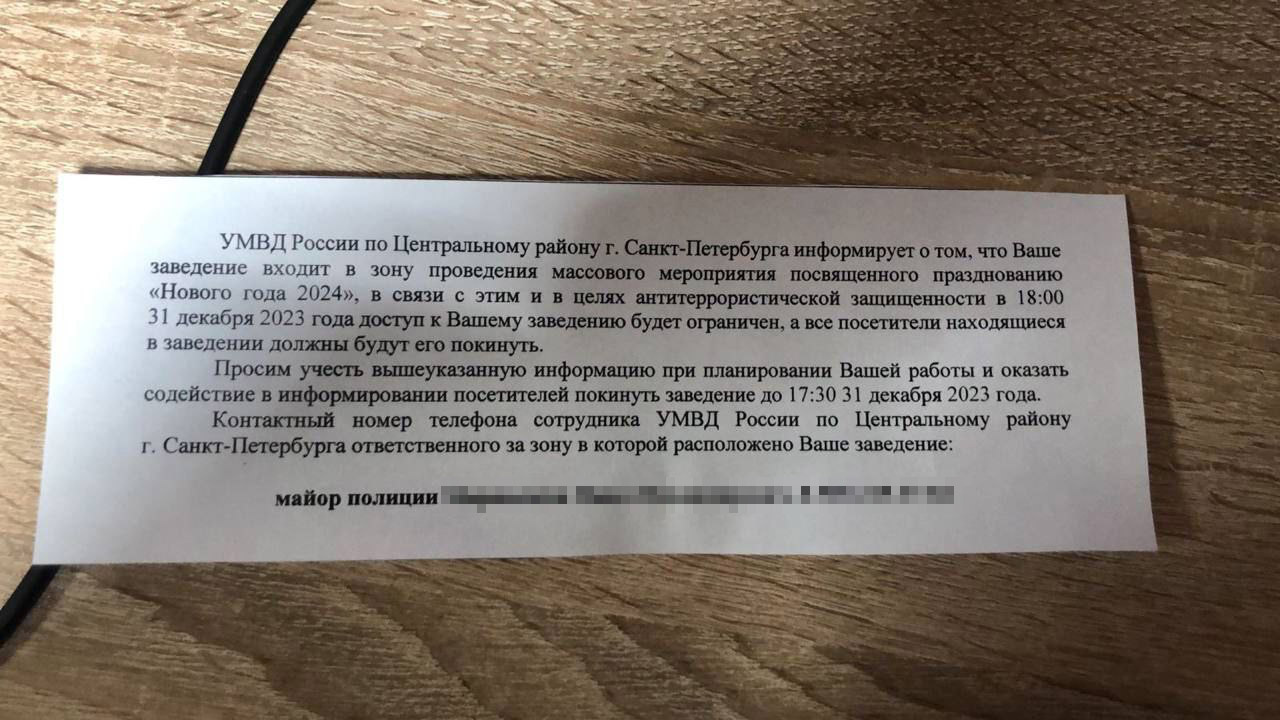 В записках, которые оставили в заведениях, в частности указывались ответственные лица. «Фонтанка» позвонила одному из них. Ответивший майор полиции подтвердил, что действительно рестораны должны быть закрыты. Он сообщил, что это делается для безопасности гуляющих в центре Петербурга.