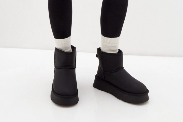 Особенность модели — толстая чёрная подошва высотой в четыре сантиметра, с которой точно не утонешь в грязи и слякоти. Пара выполнена в чёрном цвете. С одной стороны, это будет отличать обладательницу от тех, кто предпочитает классические горчичные черевички. С другой, это решение, которое подойдёт подо всё: угги не будут конфликтовать с нарядом и впишутся в любой лук. Благодаря высокому голенищу щиколотки будут в тепле, а низ брюк и носки не забрызгаются.