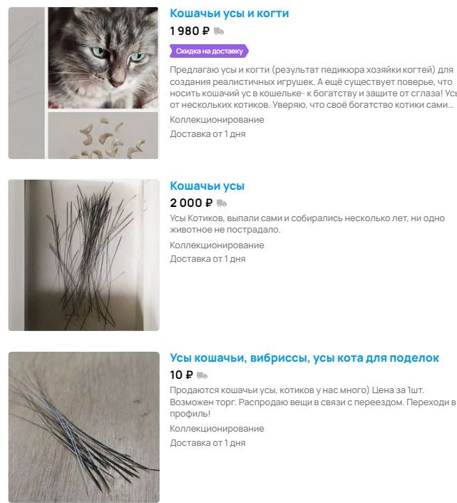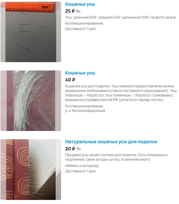 Усы котиков можно купить на популярных сайтах объявлений. Цены разнятся — от 1 980 до 10 рублей.