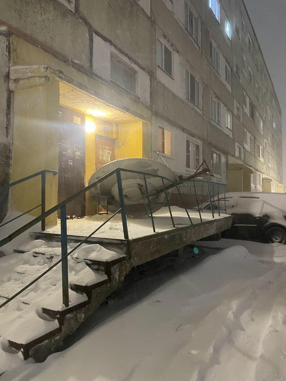 Сильная метель в Мурманской области: в Североморске ветер выбивает окна, с одного из домов сорвало спутниковую тарелку.