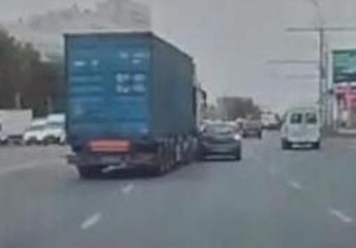 Судя по кадрам, водитель грузовика не заметил легковушку, когда перестраивался в соседний ряд, что привело к столкновению.