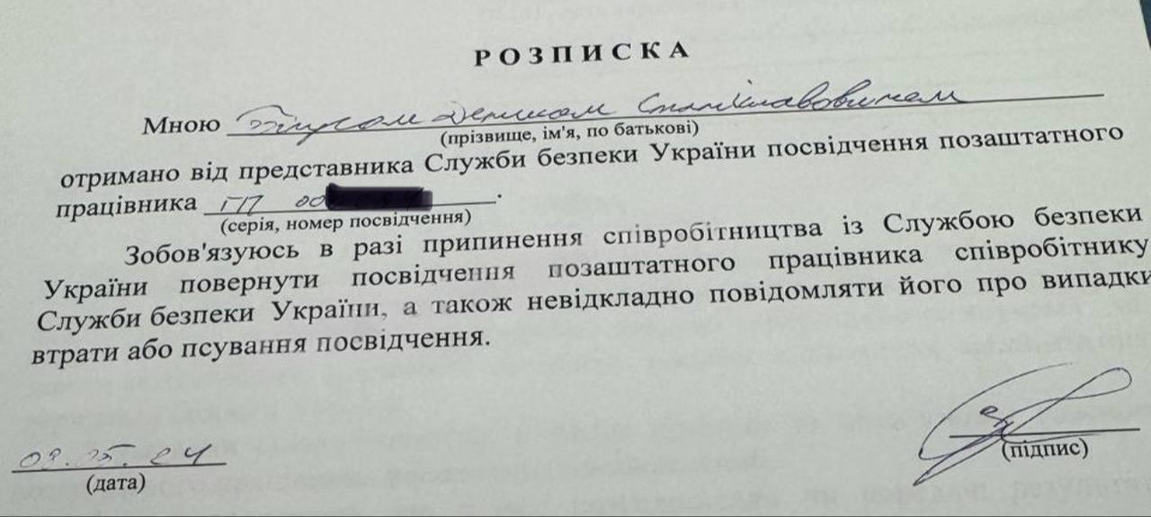 Журналист Денис Бигус, вероятно, является внештатным сотрудником СБУ: в Сети публикуют его согласие на сотрудничество и расписку о получении удостоверения