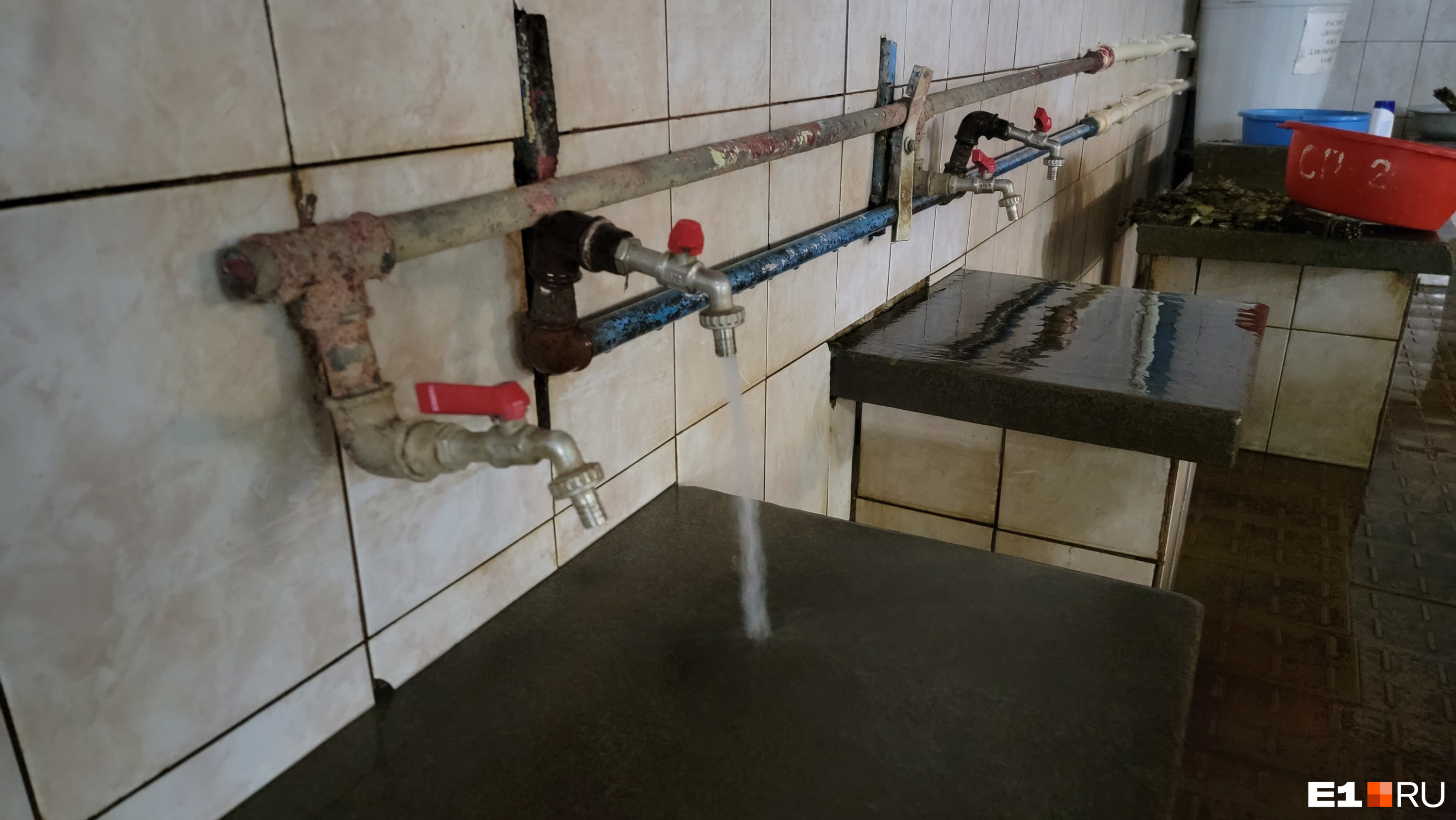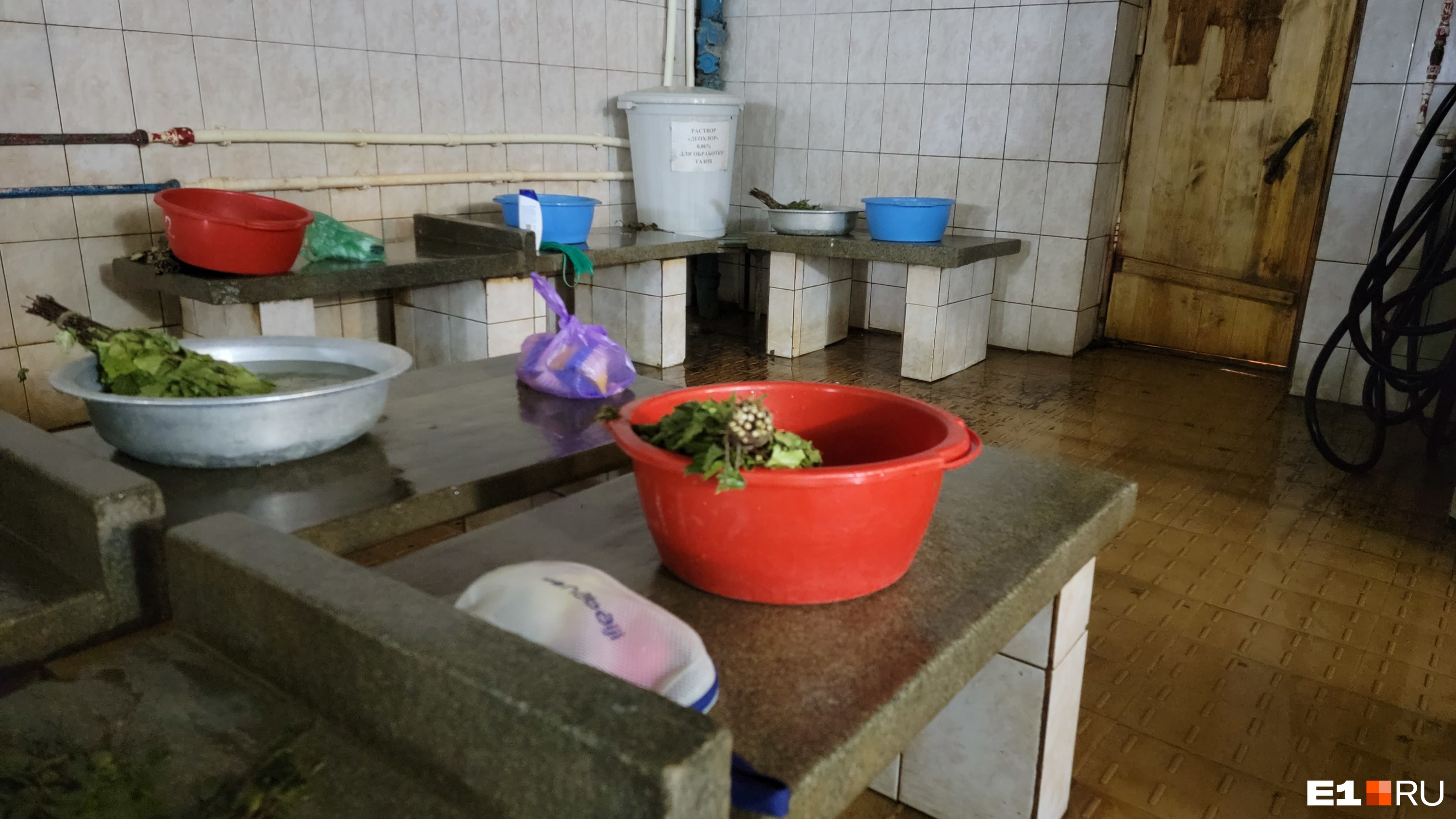 По пути в парную ждали новые неприятные открытия. На входе — деревянная дверь с черной от сырости ручкой. Касаться ее неприятно: дерево покрыто какой-то слизью. Помывочное отделение тяжело болеет. Сырость, затхлый воздух, старый плиточный пол в черных пятнах отбивают всякое желание подходить к тазам. Две душевые кабины с пластиковой сантехникой на веревочках. Два человека моются, человек пять в очереди громко беседуют.