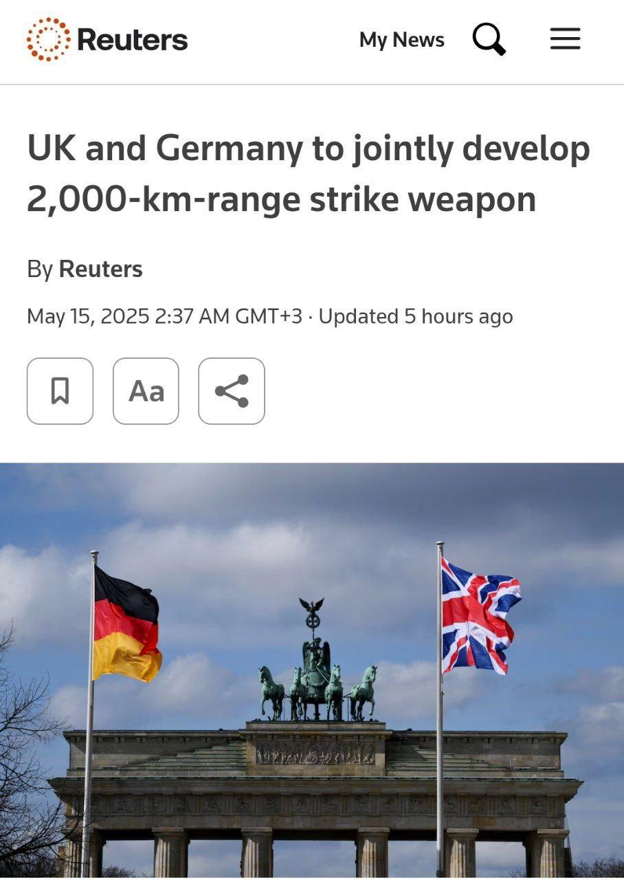 Лондон и Берлин объявили о совместной разработке нового оружия «глубокого высокоточного удара» с дальностью более 2000 км, передает Reuters. В заявлении британского Минобороны это подано как «движок роста» и вклад в «общеевропейскую безопасность». Под последним явно подразумевается «российская угроза»: от Берлина до Москвы – 1600 км, от Лондона до Петербурга – 2100 км.