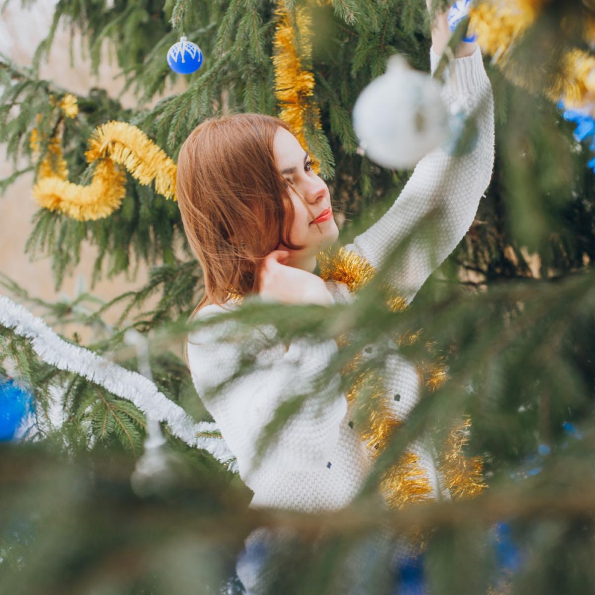 - Живая елка. Украсьте её классическими шарами, гирляндами и бантами.