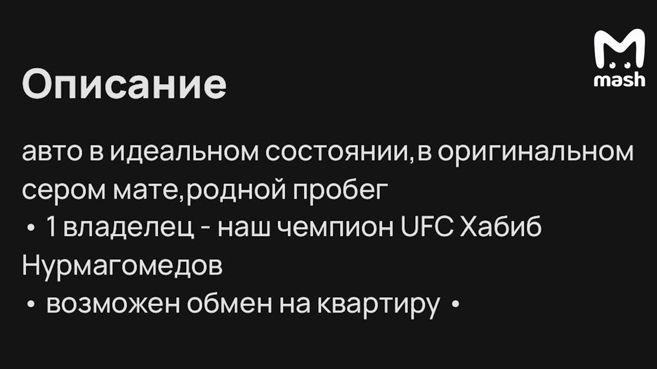 Именной Mercedes-Benz AMG GT Хабиба Нурмагомедова выставили на срочную продажу за 16 млн рублей — чтобы авто не отобрали приставы. Фанат спортсмена из Махачкалы купил машину два года назад и специально не переоформлял. Теперь из-за страха её лишиться сбросил четыре млн рублей.