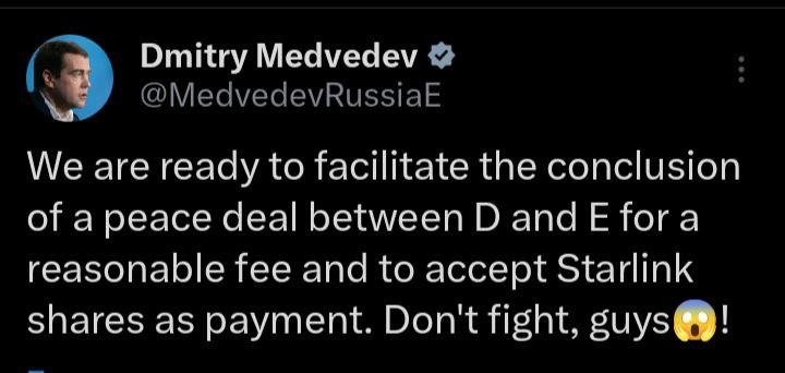 📸 Зампред Совбеза РФ Дмитрий Медведев заявил, что наша страна готова примирить Трампа и Маска, но «за разумную плату»: