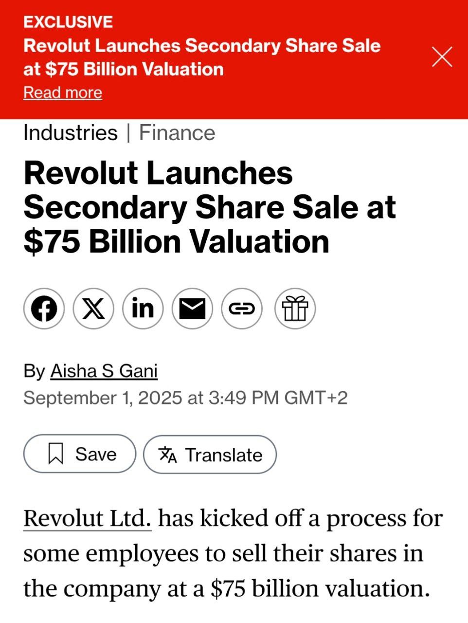 Оценка банка Revolut Николая Сторонского достигла $75 млрд в ходе последнего раунда продажи акций. Сторонскому надо увеличить цену ещё вдвое https://t.me/banksta/73521