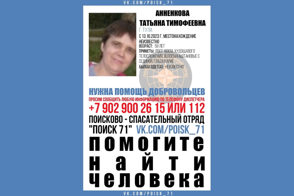 В Туле продолжаются поиски 59-летней Анненковой Татьяны Тимофеевны, которая пропала уже больше двух недель назад. Об этом сообщает региональный поисково-спасательный отряд «Поиск 71».