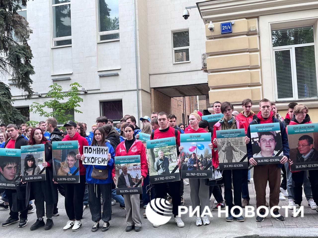 У бывшего здания посольства Украины в Москве почтили память погибших десять лет назад в результате трагедии в Одессе, передает корреспондент РИА Новости