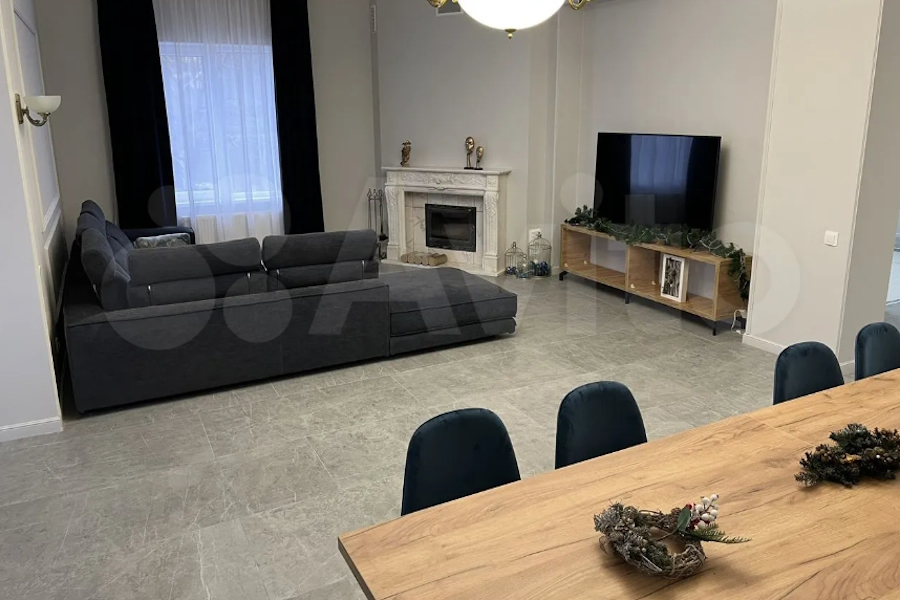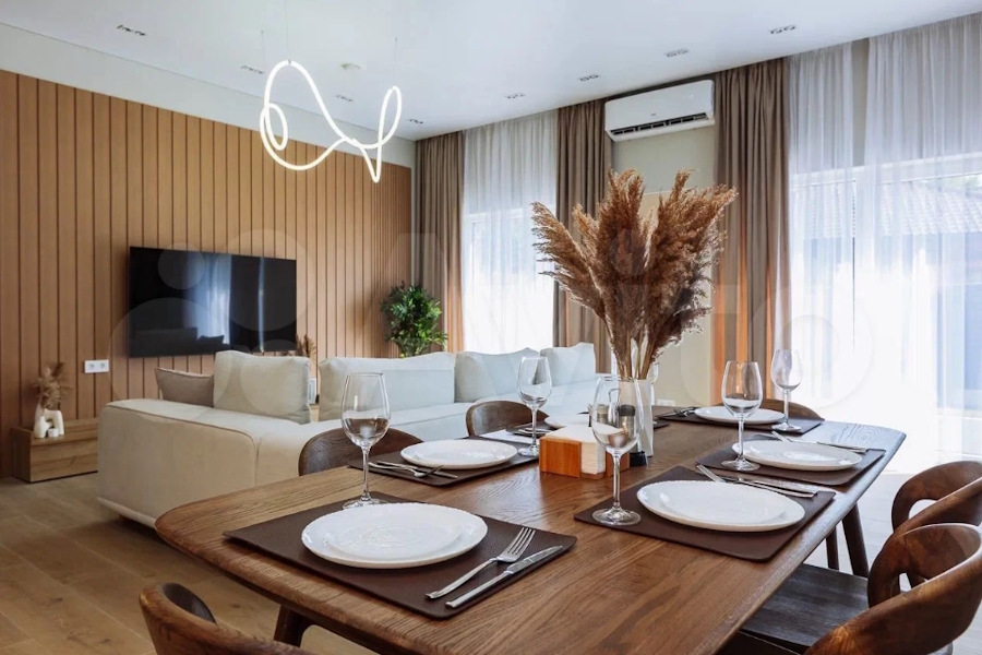 Двухэтажный дом площадью 250 м² находится в Балтийском проезде, в 93 метрах от моря. Разместиться здесь могут до восьми человек. В их распоряжении будут четыре спальни с пятью кроватями, кухня-гостиная и три санузла. В каждой комнате обещают кондиционер. Также в числе заявленных удобств тёплый пол, средства гигиены, постельное бельё, полотенца и «полноценный набор кухонной утвари». На территории расположены русская баня на дровах, бассейн с круглогодичным подогревом, лежаки, мангал-гриль, терраса со столом и паркинг на шесть автомобилей.
