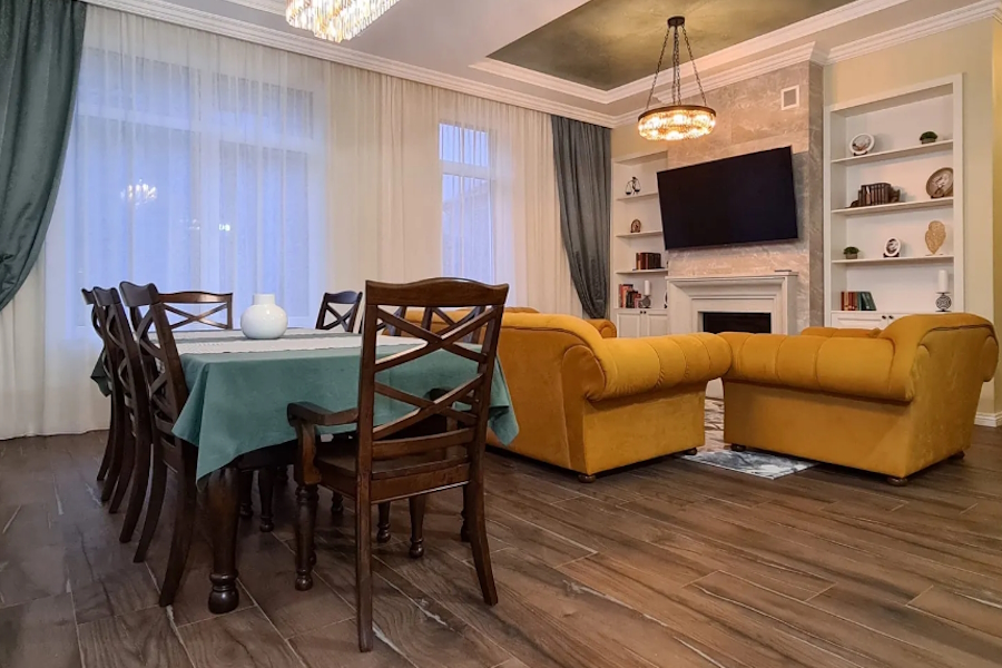 Трёхэтажный дом площадью 400 м² находится в Звёздном проезде и может вместить до 18 человек. В их распоряжении гостевой зал с камином, кухня, холл, четыре комнаты с санузлами на втором этаже и апартаменты на третьем. В подвале оборудована баня с комнатой отдыха.
