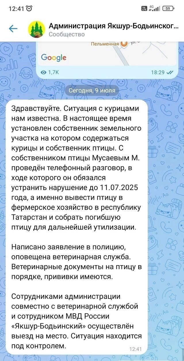Селяне обращались в различные инстанции, и вскоре появилась информация, что владелец куриц найден. Он обязался до 11 июля вывезти живых птиц в Татарстан, а погибших — убрать с территории населенного пункта. Однако обещание он не выполнил, наседки продолжали разгуливать по Якшуру. И вот, кажется, жители деревни дождались финала этой дурно пахнущей истории.