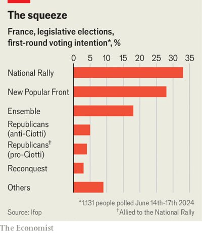 Прогнозы дают крайне-правому «Народному фронту» (33%) и левому «Новому народному фронту» (27%) около 60% на двоих в парламенте Франции.