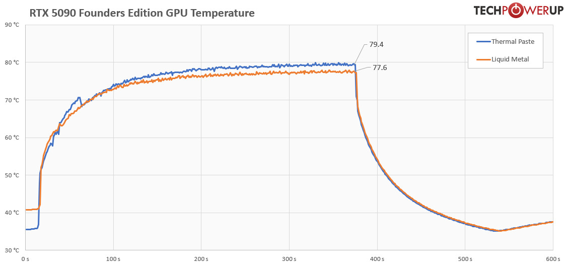 Температура GPU с термопастой выросла в среднем всего на 2 °C по сравнению со стандартным решением. Максимальная температура с оригинальным жидким металлом составила 77,6 °C, а с Arctic MX6 — 79,4 °C. Разница в 1,8 °C незначительна, особенно если учесть, что изменения комнатной температуры могут вызывать более серьезные колебания. Производительность видеокарты осталась на прежнем уровне, а температура обеих конфигураций не достигла порогового значения в 90 °C для RTX 5090 (вместо 83 °C для RTX 40xx).