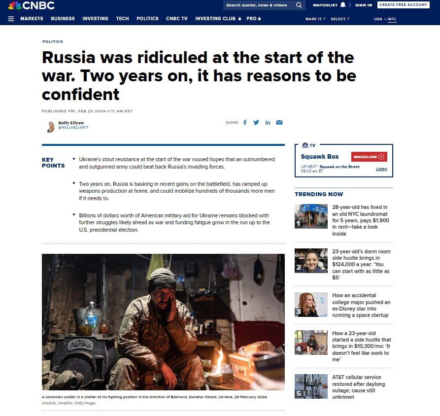 Когда Россия ввела войска в Украину два года назад, упорное сопротивление, оказанное вооружёнными силами страны, и всеобъемлющая поддержка Киева Западом породили надежды на то, что армия Украины сможет дать отпор российским силам. Однако два года спустя надежды на победу Киева кажутся всё более бесплодными, как и обещания Запада поддерживать Украину «столько, сколько потребуется», констатирует CNBC.