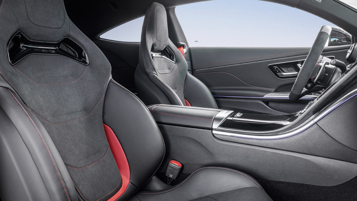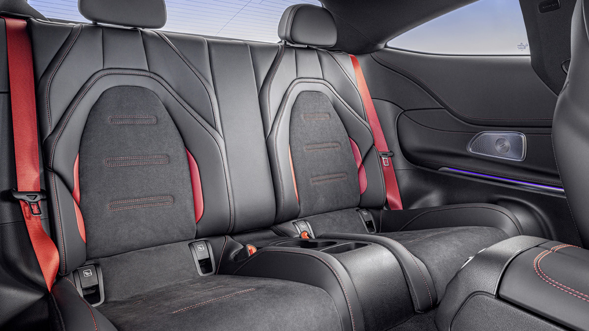 В салоне нового «горячего» купе можно увидеть отделанное кожей и алькантарой трёхспицевое рулевое колесо AMG Performance с усечённым ободом. На передней панели есть большая вставка из углеродного волокна, а спортивные кресла, оббитые кожей и микрофиброй, украсили контрастной красной прострочкой.