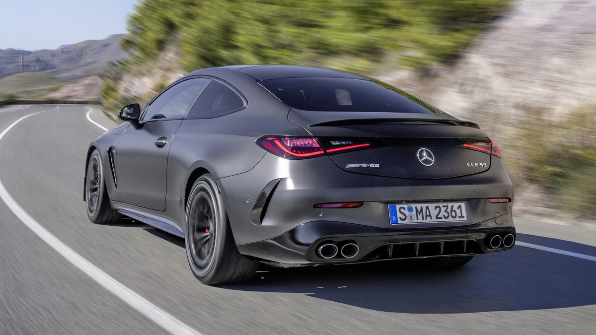 Корма Mercedes-AMG CLE 53 Coupe выглядит иначе за счёт небольшого спойлера, пересмотренных светодиодных задних фонарей, которые соединены между собой с помощью вставки, расположенной на крышке багажника, а также увеличенного диффузора и иных патрубков выхлопной системы (по два с каждой стороны).