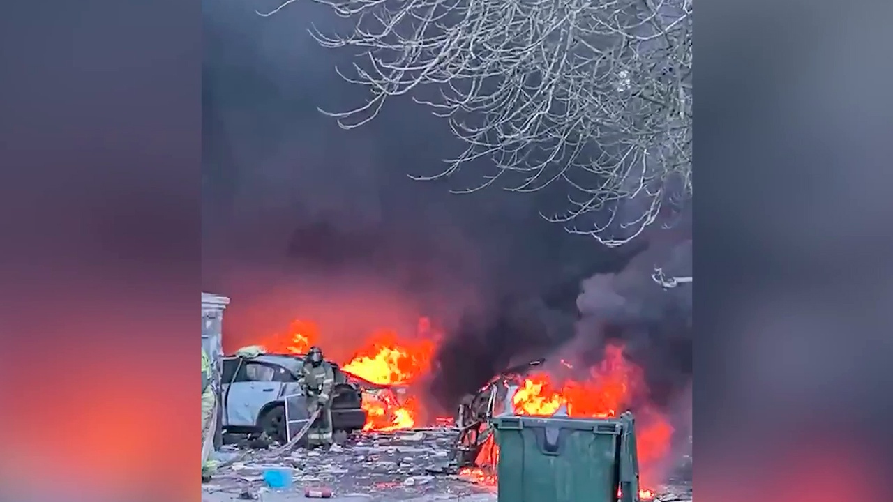 На кадрах видно, что разрушения получила жилая многоэтажка, горят рядом припаркованные автомобили. Выбиты стекла магазинов, повреждены фасады.