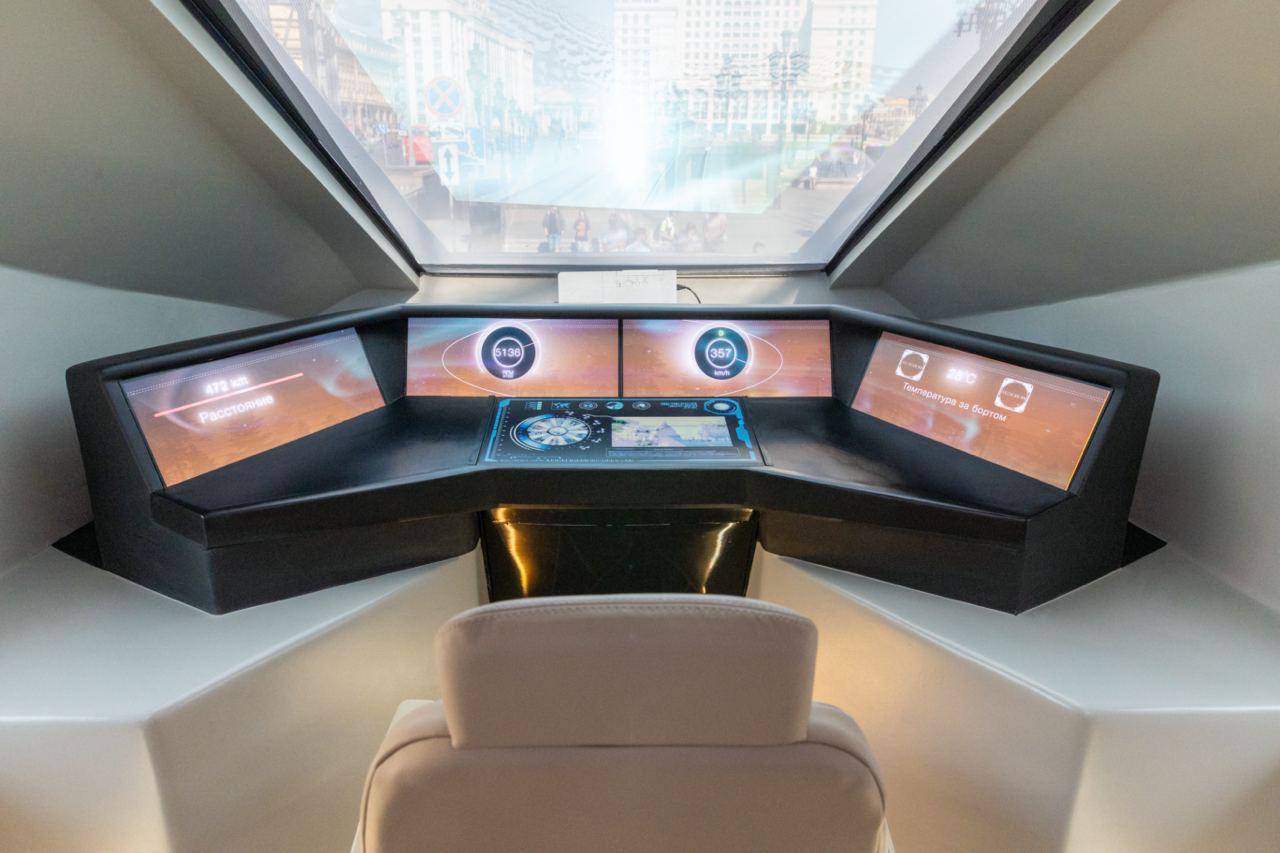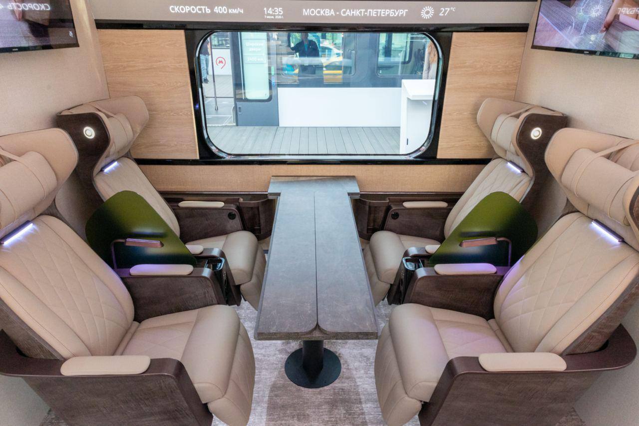 На Манежной площади продемонстрировали макет головного вагона и салон бизнес-класса «Белого кречета» для Высокоскоростной Магистрали Москва – Питер.