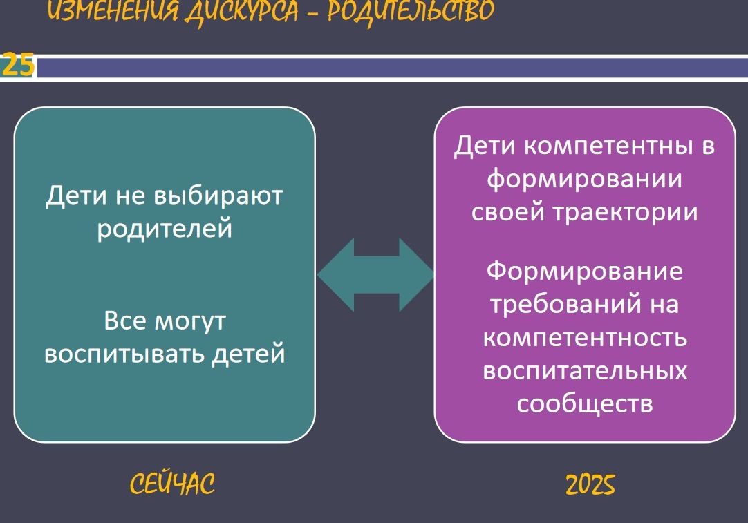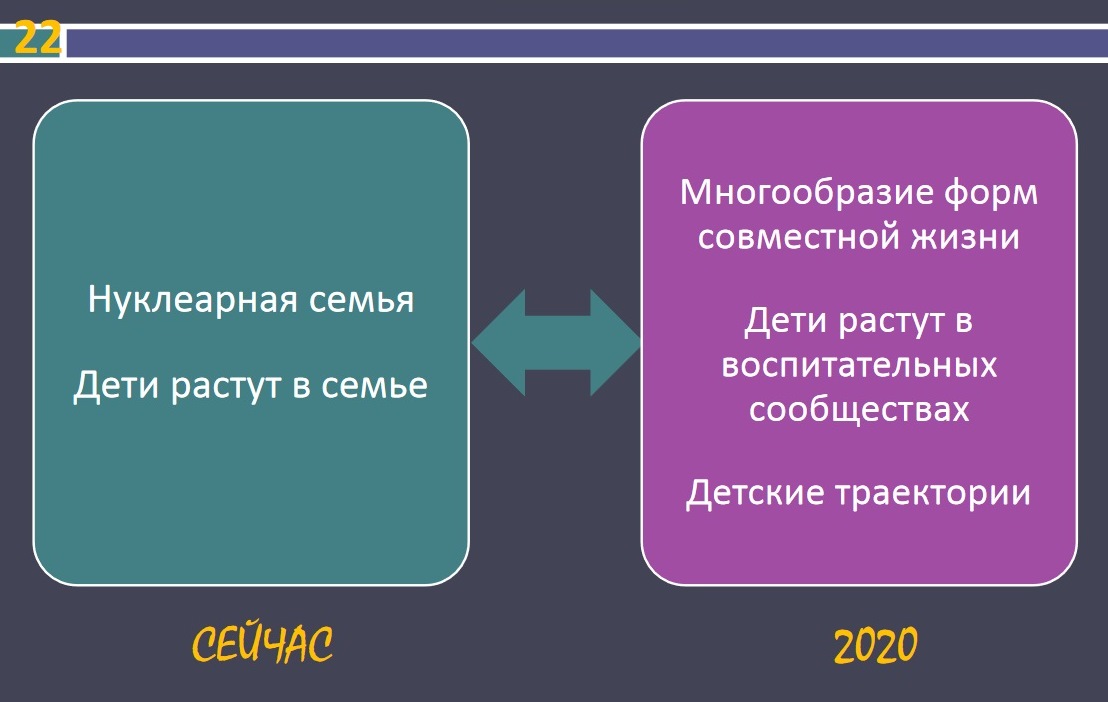 Приведем несколько важных слайдов из форсайт-проекта АСИ «Образование 2035» (результат работы т.н. форсайт-флота Пескова и Ко), направленного на слом российских традиций и уничтожение семьи. Указанным проектом, среди прочего, предусмотрен переход к «модернистской семье»: проживание в общинах, в дистанционных семьях, внедрение «компетентного родительства» («родитель как профессия»). С 2017 г. запланировано тестирование на родительскую компетентность «как норма». Раз норма, значит, - это планируется для каждого из нас.