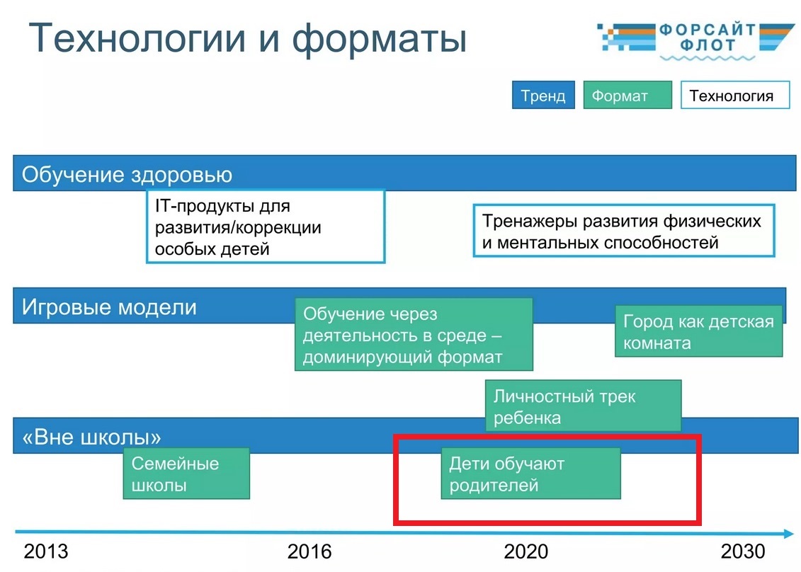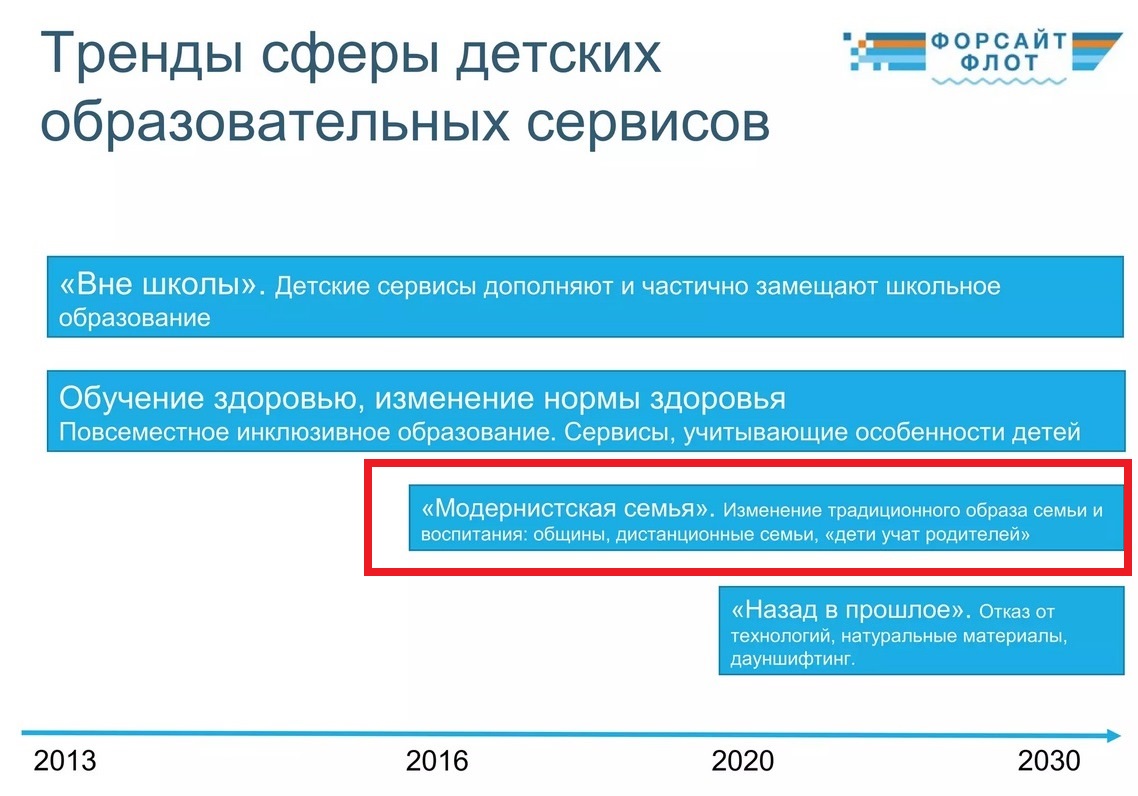 А теперь вспомним нашумевший форсайт-проект «Детство-2030», пафосно презентованный тогда президентом Дмитрием Медведевым на «Экспо-2010» в Шанхае. Он был разработан в 2008 году по инициативе и под руководством общественной палаты РФ, благотворительного фонда «Мое поколение» и МШУ «Сколково».