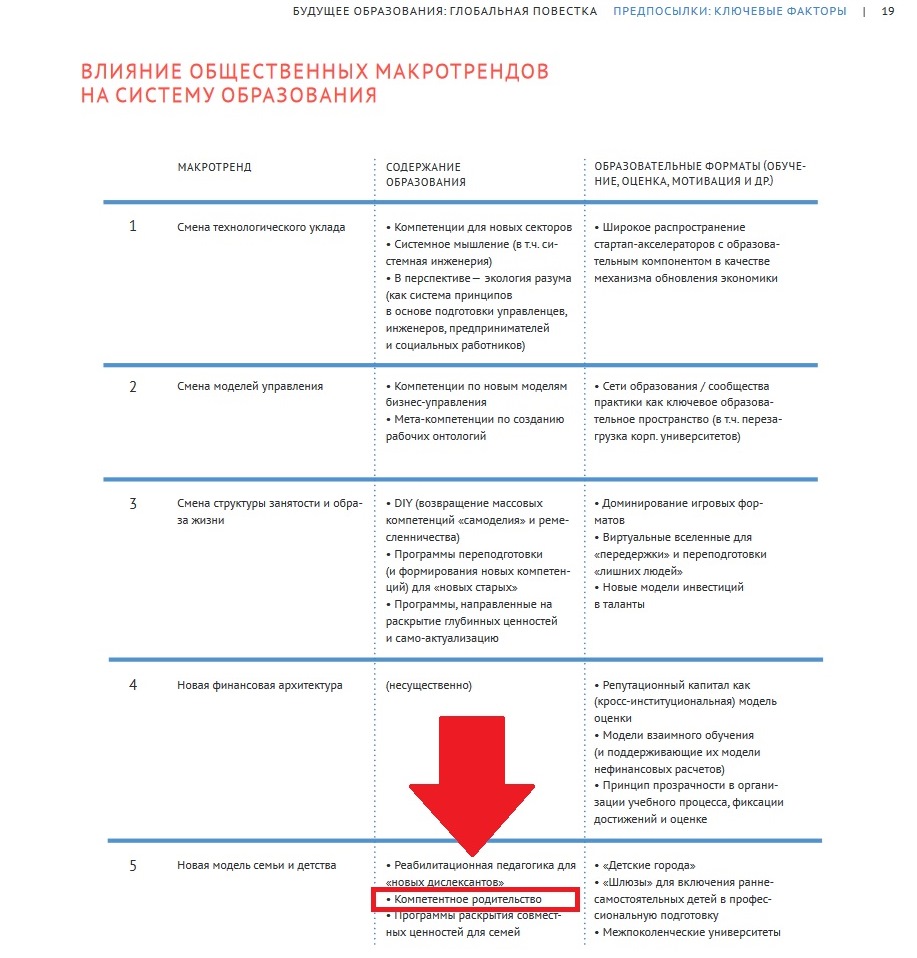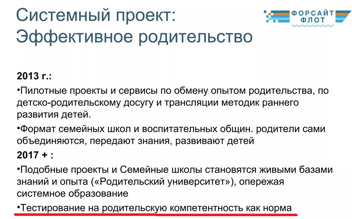 О мечтах Буцкой, только немного другими словами, говорится и в форсайте «Образование-2035» (проект АНО «Агентство стратегических инициатив», главные разработчики и лоббисты – Дмитрий Песков (ныне – ответственный за оцифровку при президенте РФ, профессор «Сколково» Павел Лукша), согласно которому еще с 2017 г. должно было стартовать массовое тестирование на родительскую компетентность «как норма» - т.е. для всех и каждого. Форсайтщики жестко намерены перевернуть традиционный уклад общества вверх дном, отторгнуть детей от родителей, превратив их в «эпсилонов» и «дельт», не помнящих родства. О том, что дети должны будут воспитываться в специальных госучреждениях, а также роботами, общинами и т.д. прямым текстом сообщается на слайдах данного форсайт-проекта (удален с сайта АСИ, но интернет помнит все), от которого «цифровые евангелисты» и их агенты влияния, как видим, не намерены отказываться.