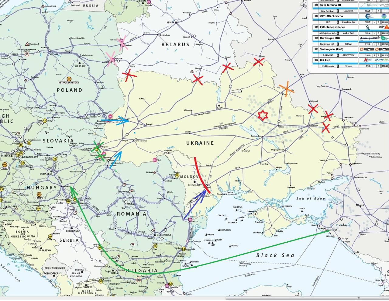 Теперь единственными маршрутами возможного импорта остались Польша и Румыния (голубые стрелки), но доступ к ним ограничен. Польша использует поставки как инструмент политического торга, а главный мощный маршрут через Трансбалканский газопровод (синяя стрелка) заблокирован в Приднестровье (красная дуга).