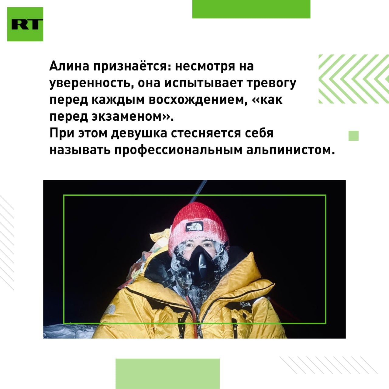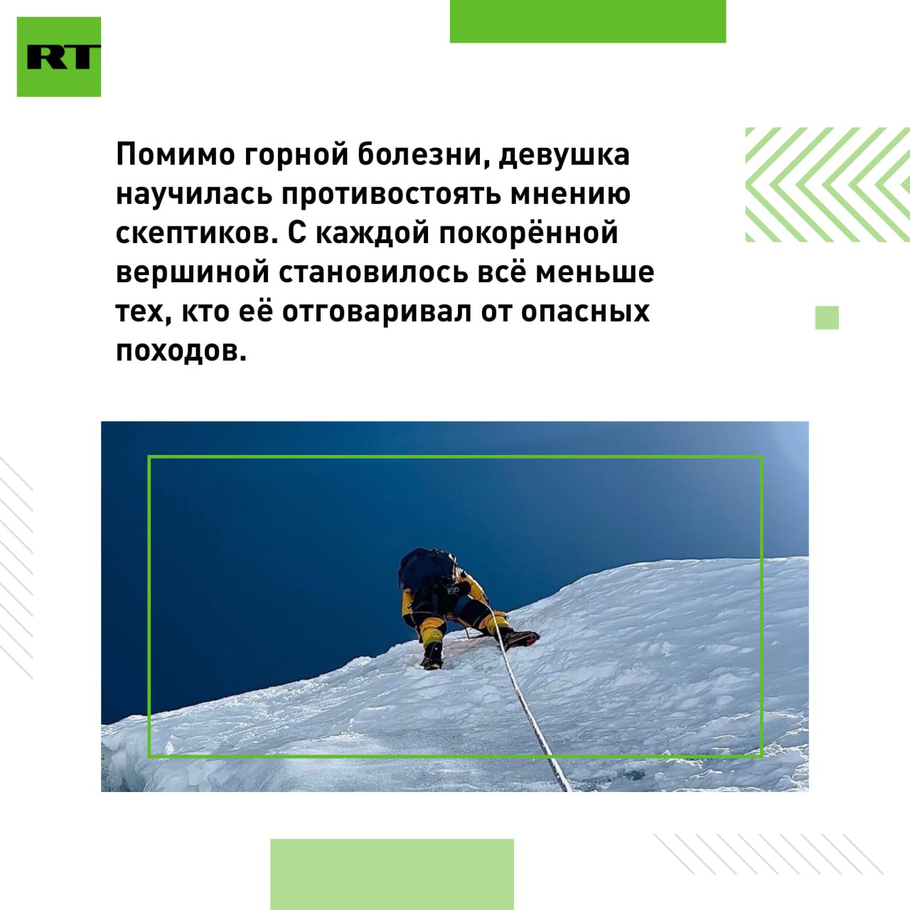 В интервью RT девушка призналась, что занимается альпинизмом не для получения дозы адреналина, а из любви к природе и уединению — без средств связи и интернета.