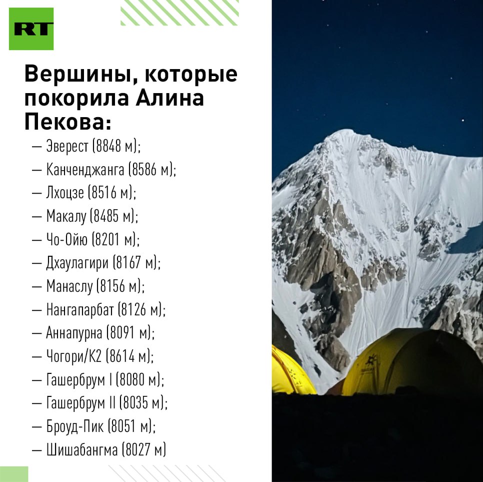 31-летняя альпинистка Алина Пекова стала первой россиянкой, совершившей восхождение на 14 высочайших вершин мира.